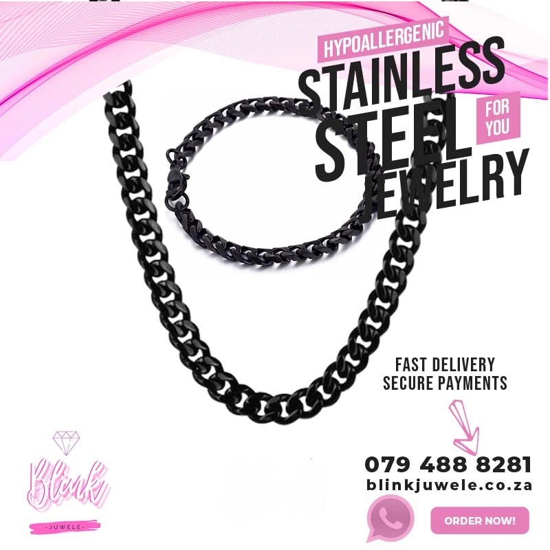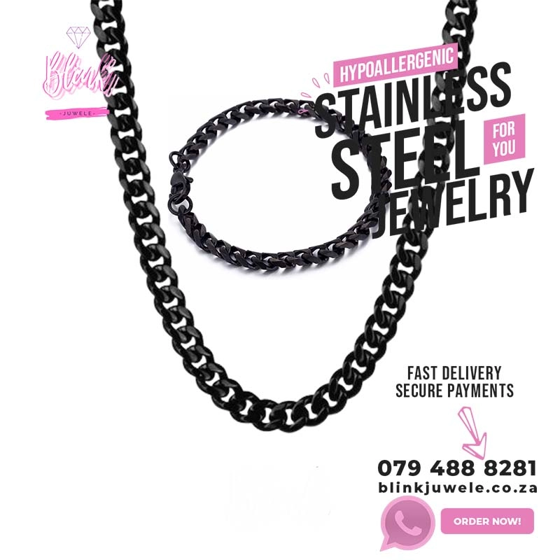 2. Premium Stainless Steel: Fashioned from high-grade stainless steel, this Bracelet and Necklace is not only a fashion statement but also a testament to durability. The black stainless steel is both alluring and robust, offering corrosion resistance and a lustrous finish that stands the test of time.